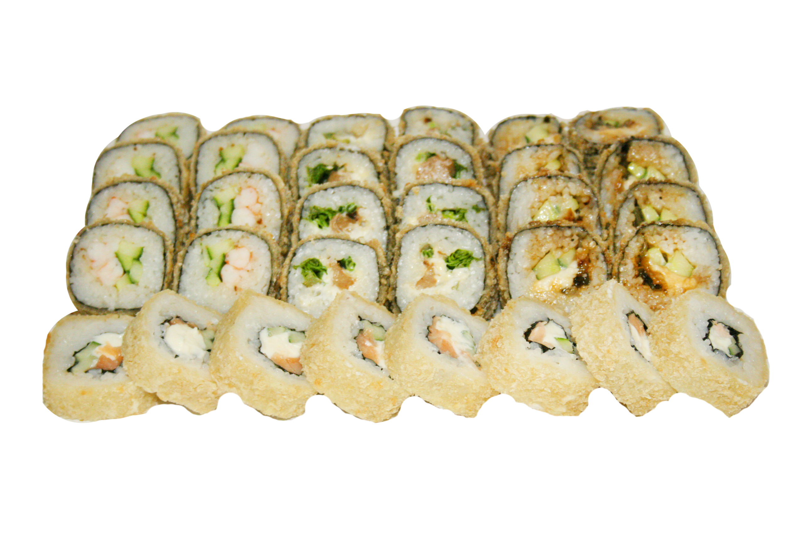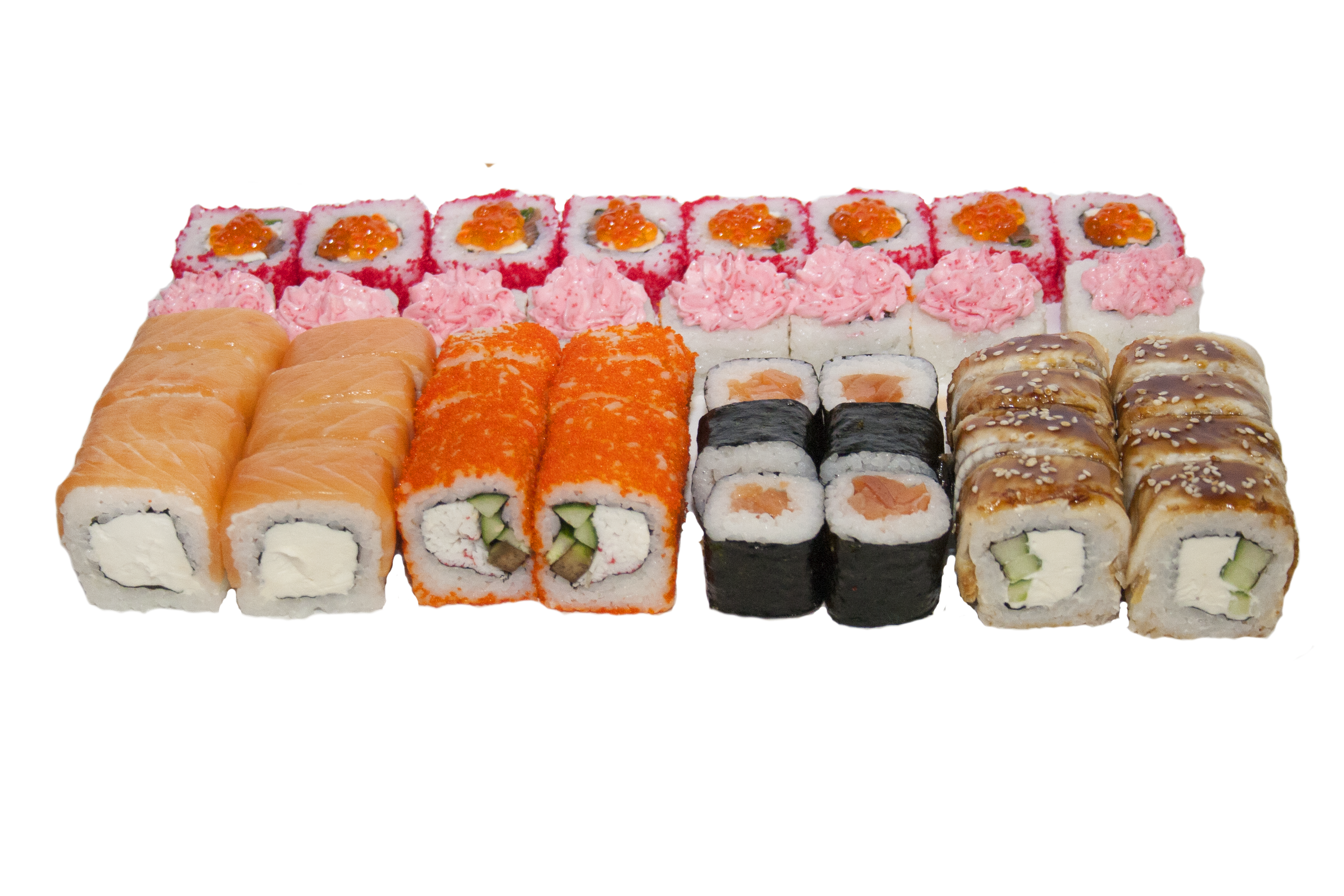 900 г. 30 шт.филадельфия с огурцом, унаги филадельфия, калифорния с крабом, сяке маки.
