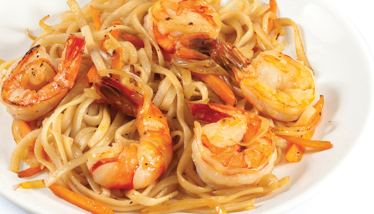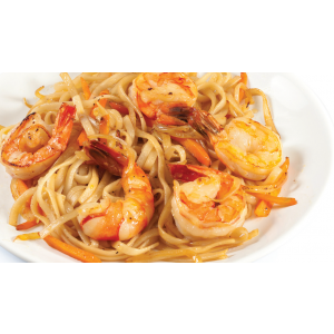 Удон, креветки, лосось, соус терияки, овощи, гриб шиитаки, зелёный лук, кунжут.