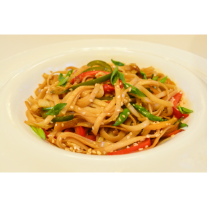 Удон, морковь, перчик болгарский, капуста белокочанная, гриб шиитаке, зел. лучок. кунжут, соус на выбор.