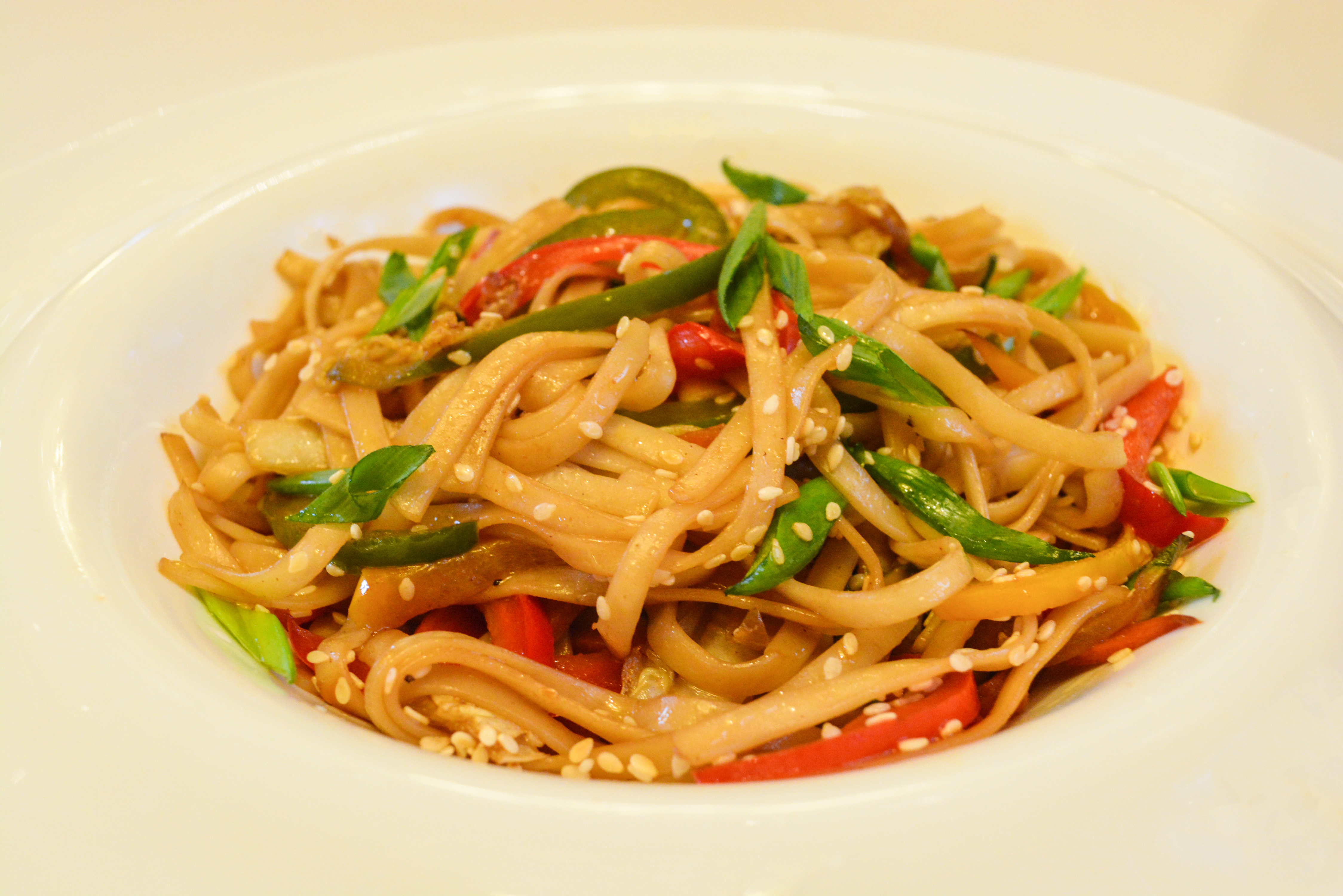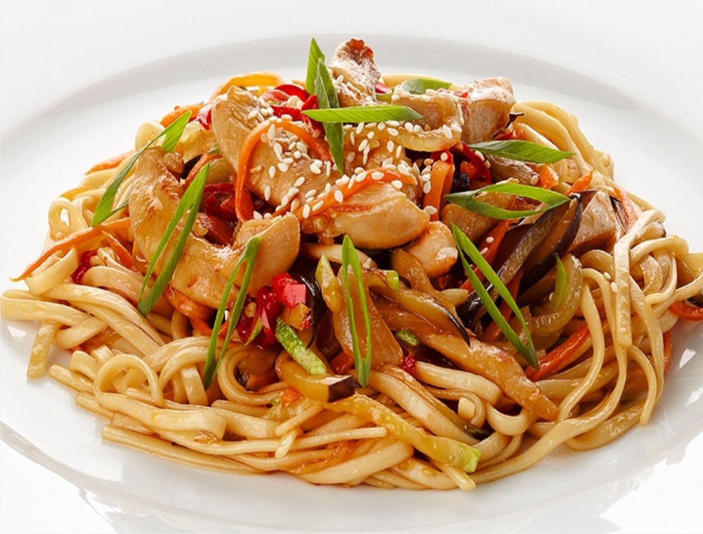 Удон, курочка, овощи, гриб шиитаки, сливки, зелёный лучок, кунжут.