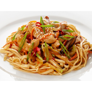 Удон, курочка, овощи, гриб шиитаки, соус терияки, зелёный лучок, кунжут.