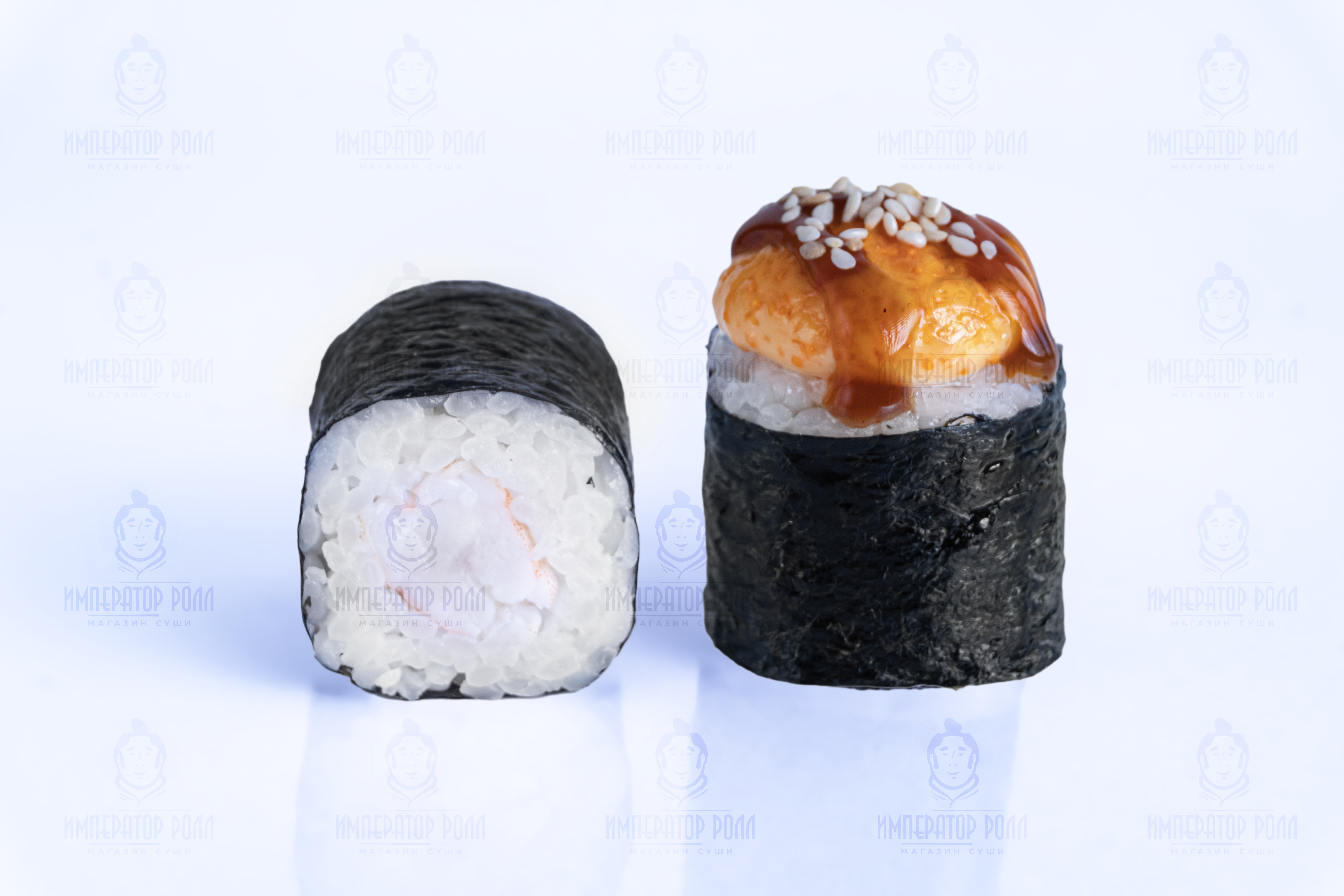 300гр./8 кус. Тигровая креветка, творожный сыр, соус табаджан, соус унаги, зеленый лучок, кунжут.