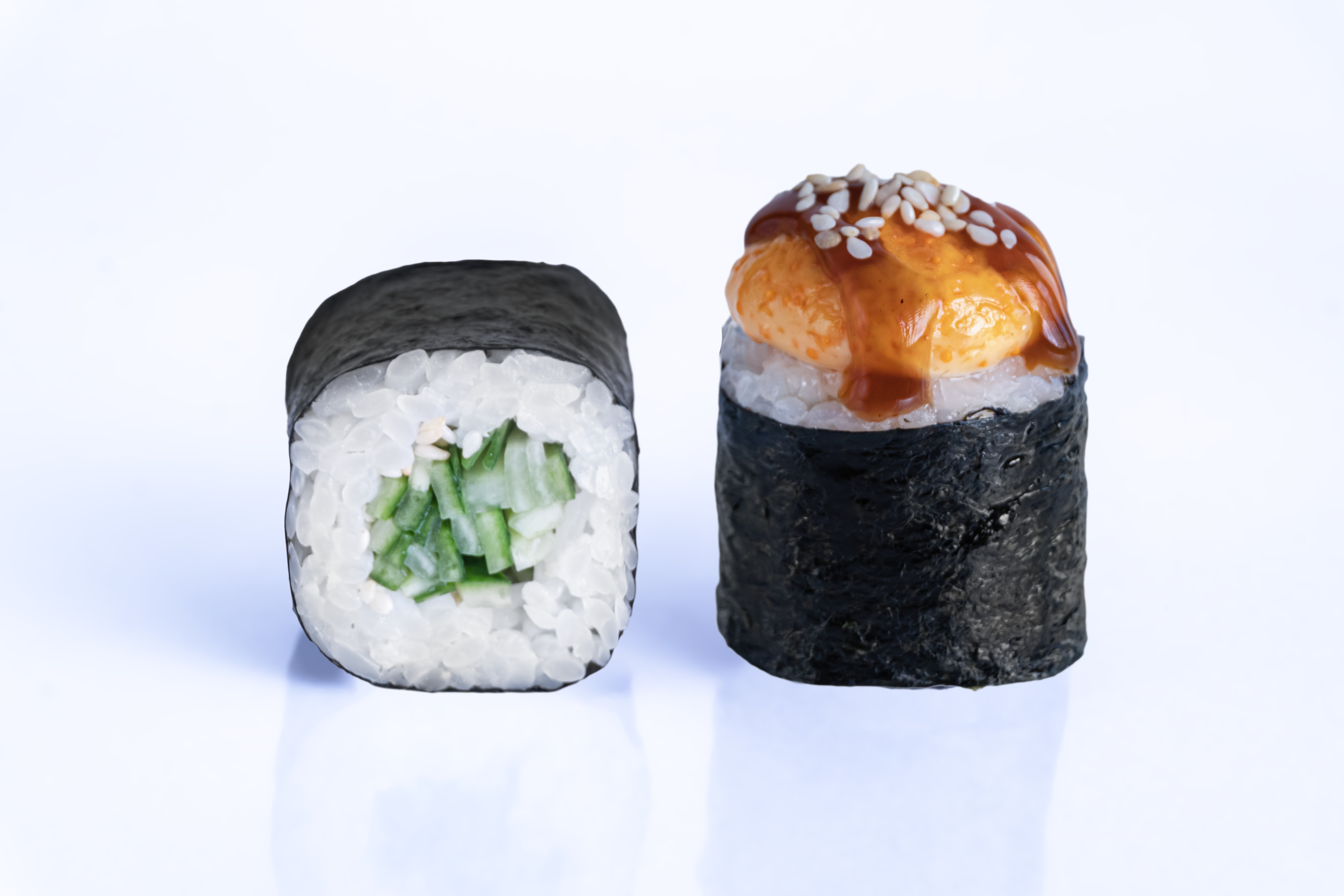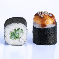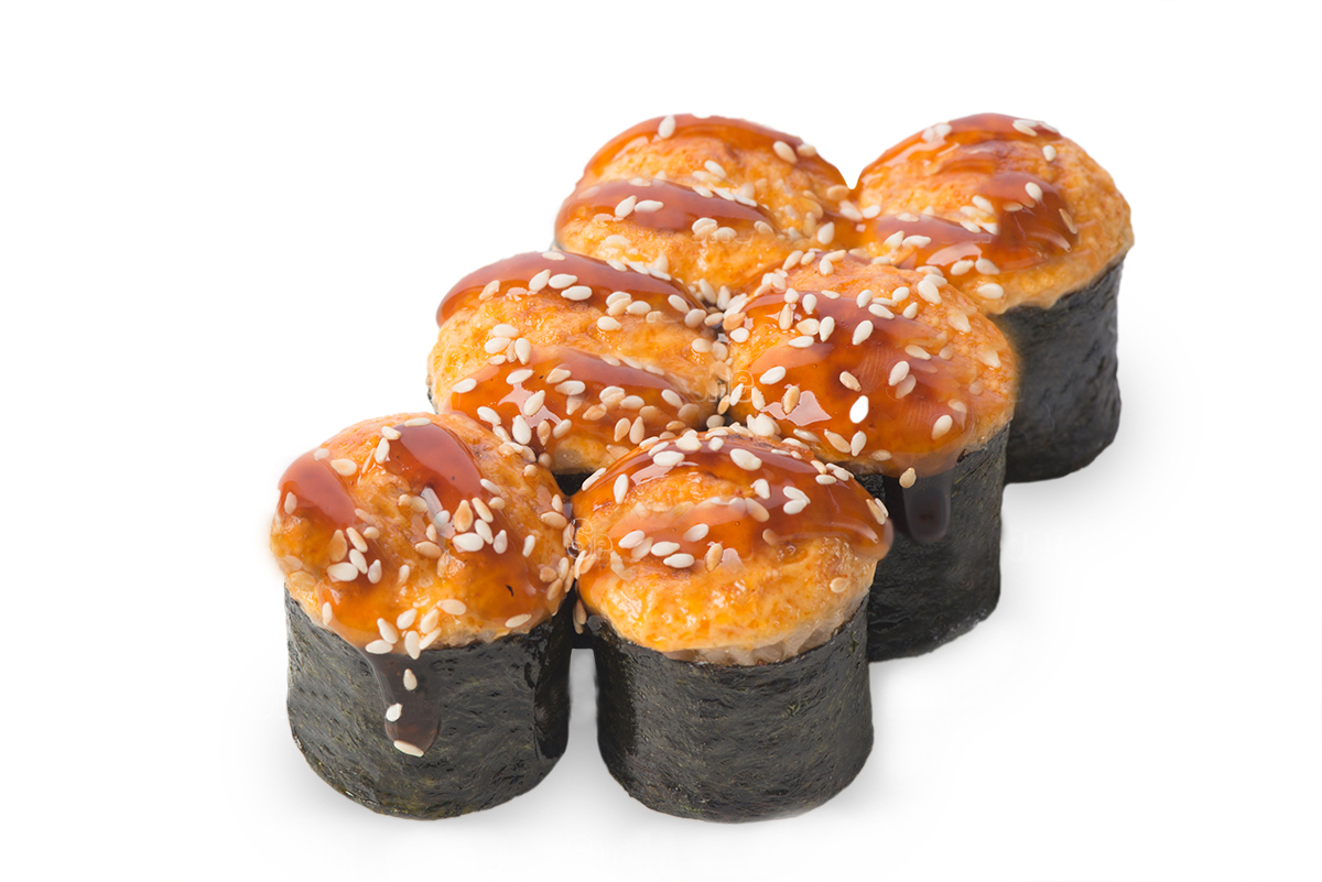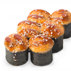 180 гр/6 кус. Запеченный классический ролл со свежим огурчиком, соусом яки, соусом унаги, кунжутом.
